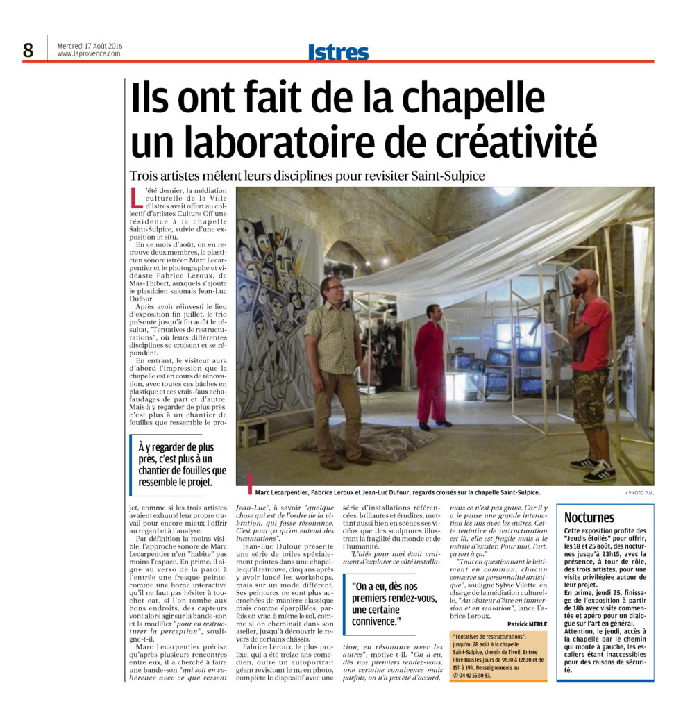 Dans la pénombre du début de nuit, tous, nombreux, debout attendaient une cérémonie… pas de bruit, quand furtive une jeune femme dans sa jupe de plastique à bulles et dentelle faite de papier accroché, chaussée de grosses chaussures rangers commença sa distribution, mains ouvertes de mêmes petits papiers pliés. Ils cachaient des mots que bientôt, on entendit, à deux voix celles des deux artistes – en photographie, sons, vidéo, installation – Fabrice Leroux et – en danse – Cedranna et dont certains se lurent sur le mur devenu grand écran.