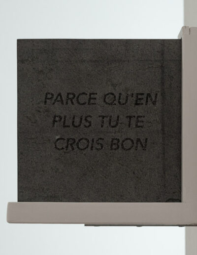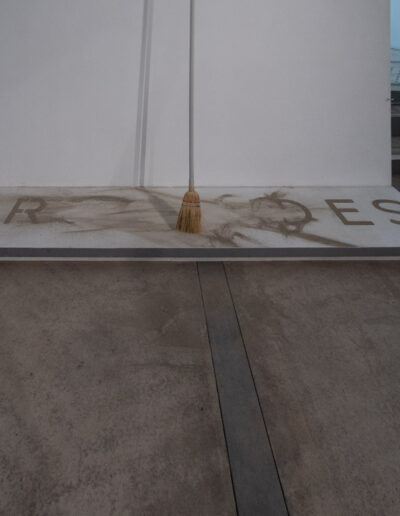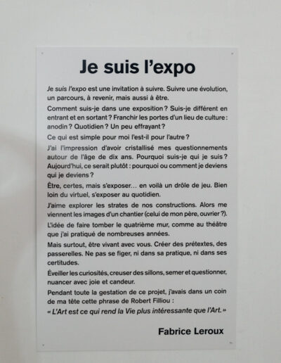Franchir les portes d’un lieu de culture : Anodin ? Quotidien ? Un peu effrayant ? Ce qui est simple pour moi l’est-il pour l’autre. J’ai l’impression d’avoir cristallisé mes questionnements autour de l’âge de dix ans. Pourquoi suis-je qui je suis ? Aujourd’hui ce serait plutôt pourquoi ou comment je deviens qui je deviens ? Être, certes mais s’exposer en voilà un drôle de jeu. Bien loin du virtuel s’exposer au quotidien. J’aime explorer les strates de nos constructions alors me viennent les images d’un chantier (celui de mon père ouvrier ?). L’idée faire tomber le quatrième mur comme au Théâtre que j’ai pratiqué de nombreuses années. Mais surtout être vivant avec vous, créer des prétextes, des passerelles, ne pas se figer ni dans sa pratique, ni dans ses certitudes. Éveiller les curiosités, creuser des sillons, semer et questionner nuancer avec joie et candeur. Pendant toute la gestation de ce projet j’avais dans un coin de ma tête la phrase de Robert Filliou : Un reset pour rester en jachère jusqu’au vernissage pour une performance hommage à Marina Abramović. Une heure et dix minutes en une minute  En savoir plus